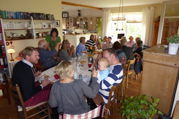 Da den ganzen Vormittag ein niederschmetternder Dauerregen vom Himmel fiel, entschieden wir uns kurzfristig, den bereits gebackenen Kuchen in gemütlicher Runde in Birkenmoor zu geniessen. Über 20 gut gelaunte Menschen bevölkerten unser Esszimmer und unterhielten sich glänzend. Unser eigentliches Ziel, der Spargelhof Gut Friedrichshof, wird sicherlich in einem anderen Jahr von uns angefahren.